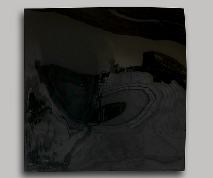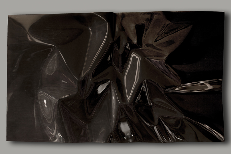 c'est que le noir, qui n'est pas une couleur (il en serait plutôt l'absence), ne se contente pas d'avaler la lumière : dès lors qu'il est brillant, comme c'est le cas de ces sculptures vernies comme des pianos, il renvoie au spectateur l'image de la totalité de ce qui l'entoure, y compris de lui-même. Mais il le fait, à cause de la géographie froissée des surfaces, par fragments éclatés, étrangement bordés et circonscrits...on ne reconnaît plus ce qui se reflète, pas plus que l'on ne s'y retrouve dans les creux et reliefs de la sculpture elle-même, au point de ne pas même distinguer un creux d'une bosse.