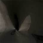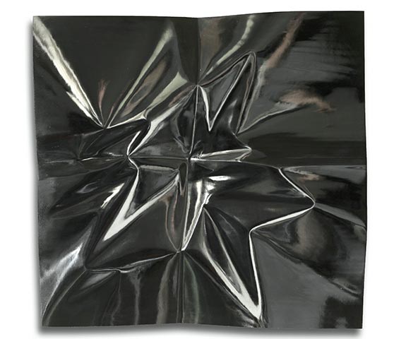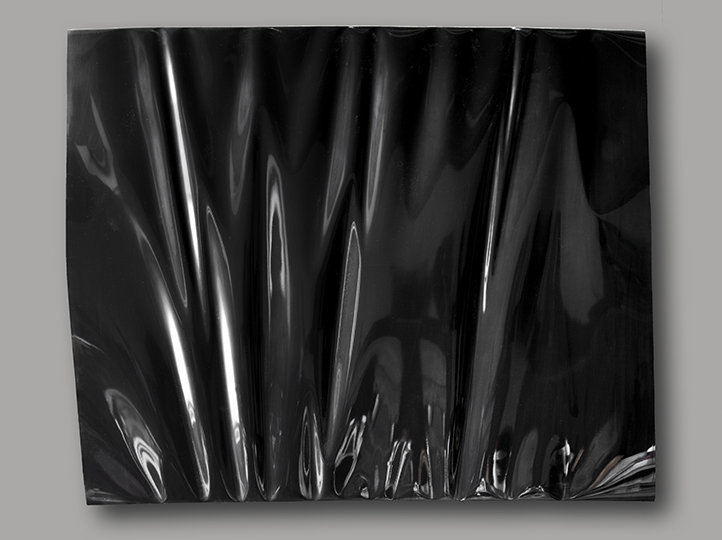 à l'occasion de ces "œuvres en noir", on se remémore et on vérifie toutes les paroles de Soulages et de son outrenoir ; mais le travail des froissements, des plis et faux-plis me conduit à y ajouter la dimension du trouble, puisqu'au sens propre, on ne sait plus ce que l'on voit. Le panneau présente une surface sourde, opaque et sombre, mais toute une constellation de petits reflets vifs et précis lui donnent la gaité d'un beau ciel de nuit, en même temps qu'ils elle renseignent aussi sur ce que l'on voit, en tout cas sur la présence d'une surface friselée, près de nous.