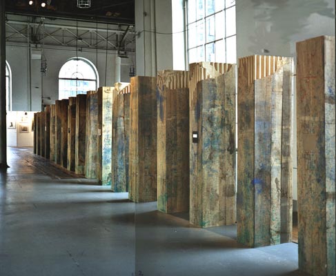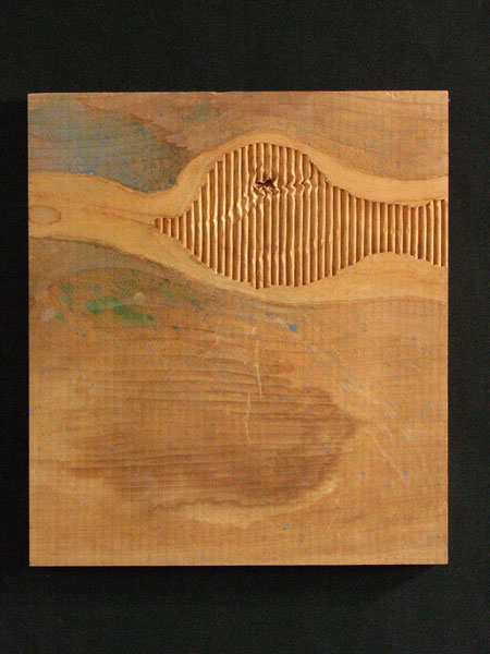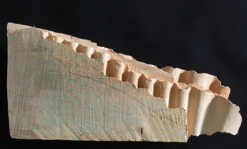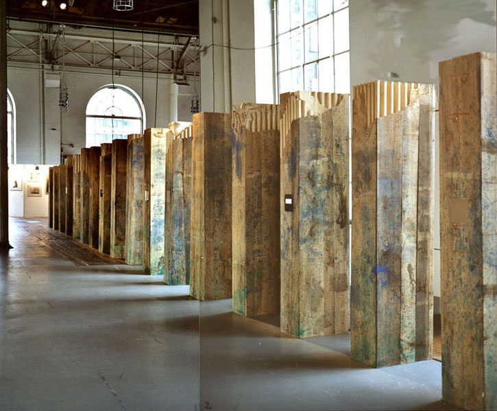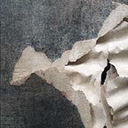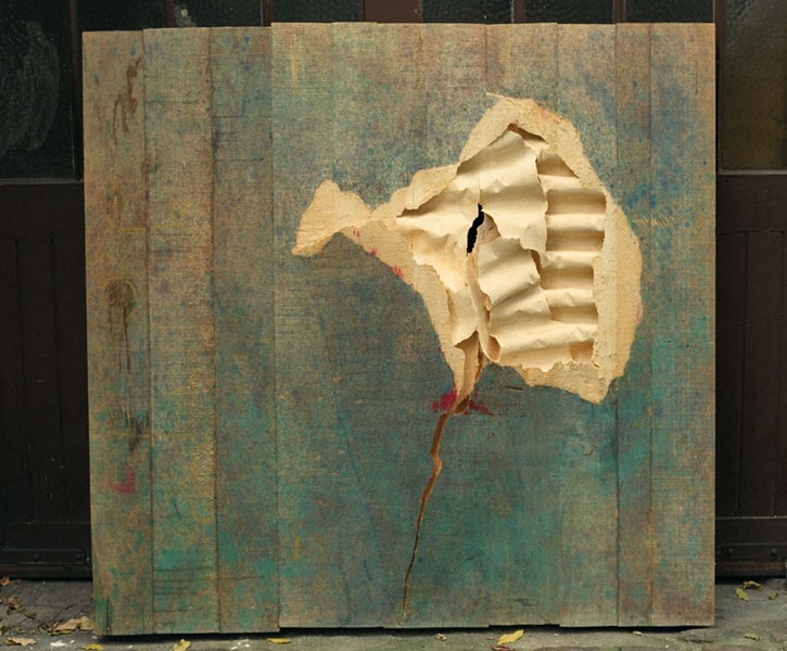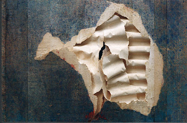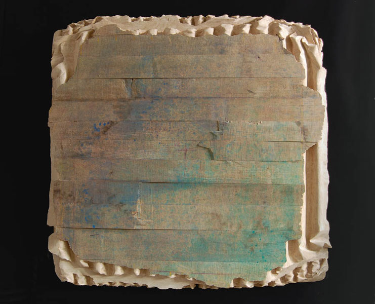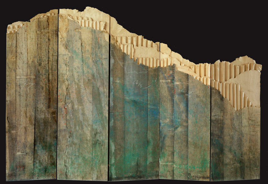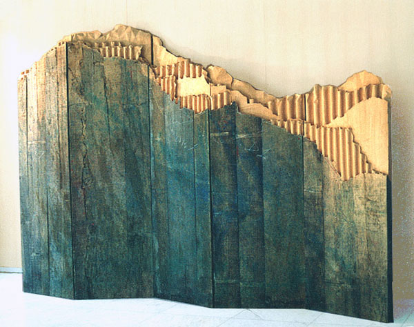 Derrière ce néologisme (m’accorde-t-on une licence poétique ?) se cache une matière imaginaire : lassé peut-être de la broderie délicate des fragments de cartons, mais pressé aussi par mes amis architectes de donner une dimension monumentale à mon travail, j’ai imaginé une matière primitive, un peu préhistorique, tellurique, minérale, dont des morceaux déchirés nous seraient ainsi parvenus ; une matière archéologique, donc. Moitié muraille, moitié montagne, elle est inspirée du carton, et ses blessures (déchirures) dévoilent les ondulations dont elle est faite, alors que sa surface laissait croire à la densité d’un bois dur.